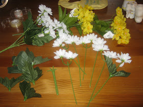 Step seven: Wire flowers and leaves together onto stems to make bigger bunches of flowers and prevent crowding in the foam. Be sure to cover any wire you use with floral tape to hide the shiny wire and prevent any unraveling.
