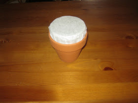 Step 1: Take the green floral insert and cover it with the coffee filter, pin it in place with the push pins. Depending on the size of your insert, it may not cover the whole insert. That's okay, just put the uncovered side into the flower pot. I use the coffee filter because as your push flowers into the styrofoam it sheds, and the coffee filter keeps the shedding to a minimum.