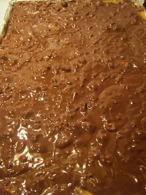 Sprinkle Chocolate Chips on top and then put the pan back in the oven for no more than 2 minutes. I have found the peanut butter isn't quite hot enough to melt the chocolate chips so that's why I throw it back in the (cooling) oven.