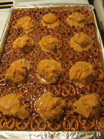 Remove from oven and turn it off. Glob the peanut butter evenly across the surface of the hot caramel pretzels. Let it sit for about 2-3 minutes and it will start to melt from the carryover heat. Once it starts to melt, spread it over the entire surface of the pretzel/caramel mixture.
