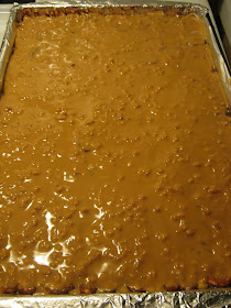 Remove from oven and turn it off. Glob the peanut butter evenly across the surface of the hot caramel pretzels. Let it sit for about 2-3 minutes and it will start to melt from the carryover heat. Once it starts to melt, spread it over the entire surface of the pretzel/caramel mixture.